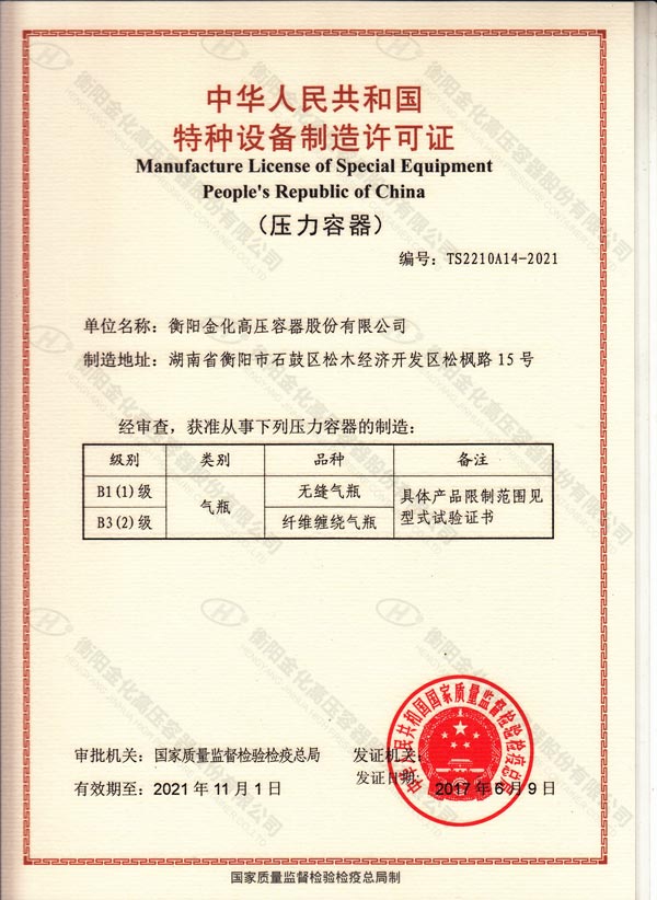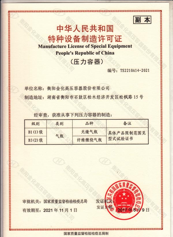 Manufacture License of Special Equipment PRC (Period of validity: 2017.6.7-2021.11.1)